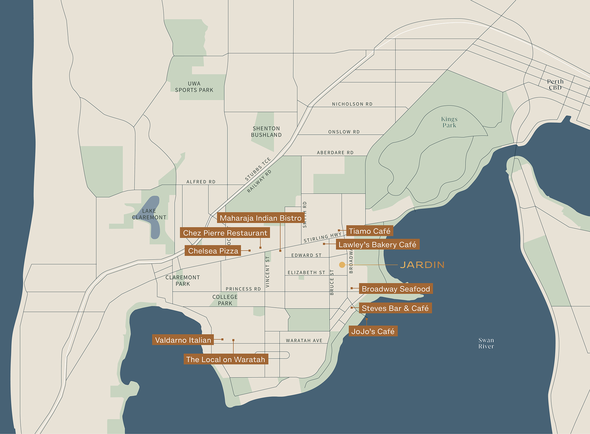 At Jardin, you’re part of one of Perth’s most coveted riverside suburbs – with leafy streets, Matilda Bay moments away, and the CBD just a short drive, bus ride, or riverside cycle.